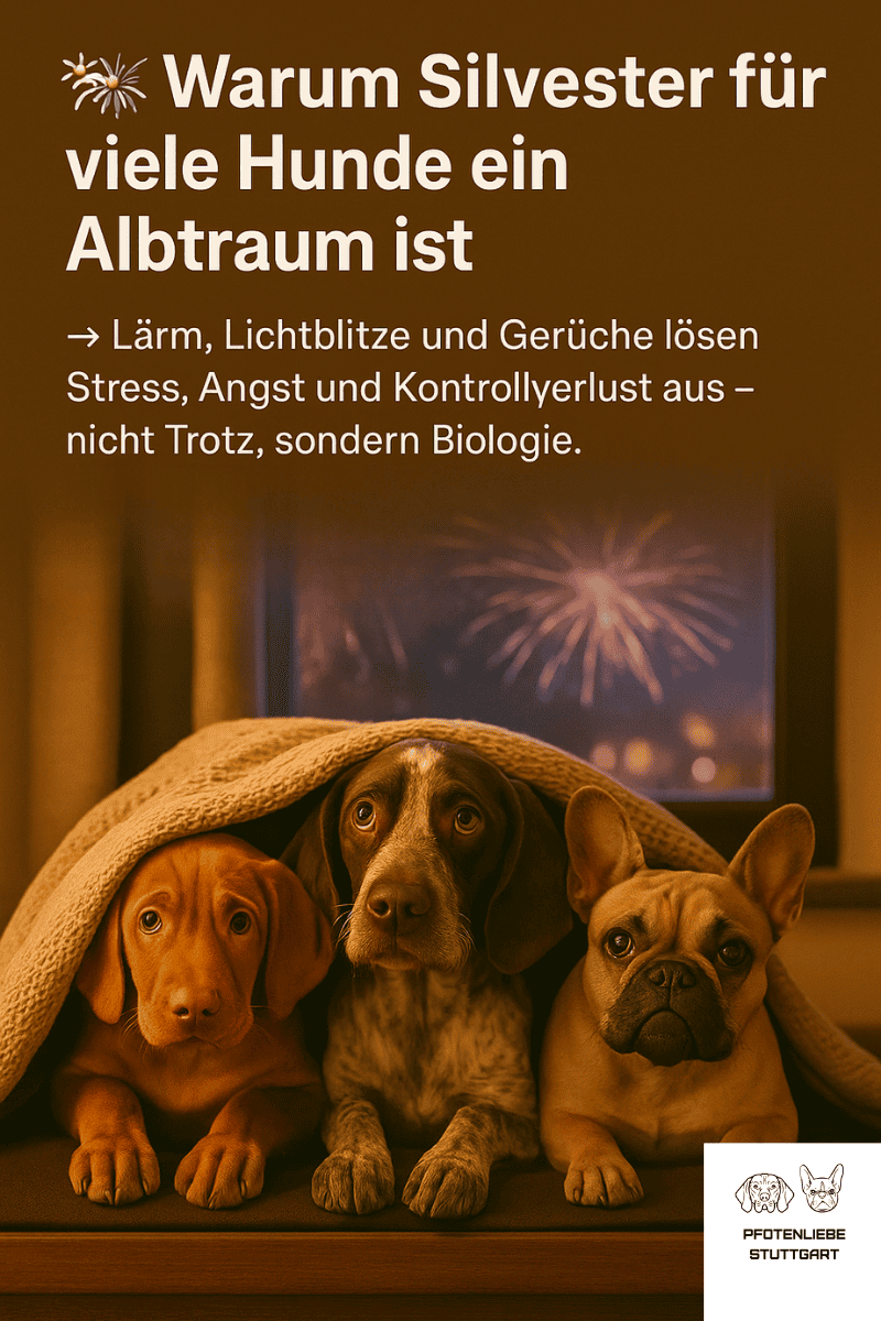 Für viele Hunde ist es schlicht nicht erklärbar, was da draußen passiert – sie sehen Lichtblitze, hören Knalle und spüren die Aufregung ihrer Menschen. Das Gehirn kombiniert diese Reize zu einem einzigen: Gefahr!