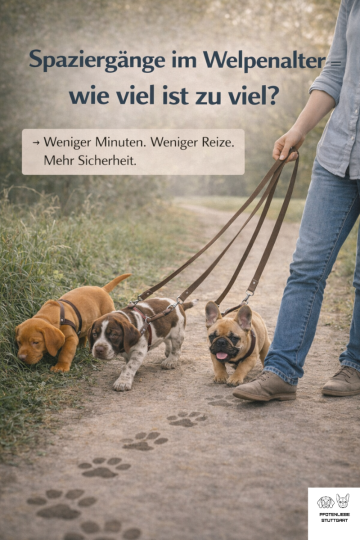 Ein Welpe befindet sich in einer wichtigen körperlichen Entwicklungsphase: Knochen, Gelenke und Muskulatur sind noch weich und im Aufbau. Zu viel oder falsche Belastung kann langfristige Schäden verursachen. Spaziergänge dienen in dieser Zeit nicht der Auslastung – sondern der behutsamen Gewöhnung an Umweltreize.